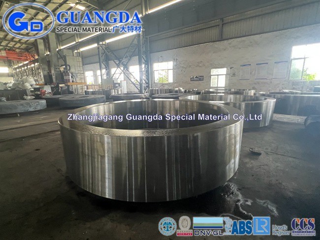 Espacio en blanco forjado grande de alta calidad del anillo de la fuente de Guangda o piezas semielaboradas o acabadas para la fabricación del eje. El tratamiento térmico y el trabajar a máquina áspero están disponibles de nuestra compañía. Podemos ofrecer los anillos forjados que se pueden modificar para requisitos particulares según su forma, tamaño, y material.